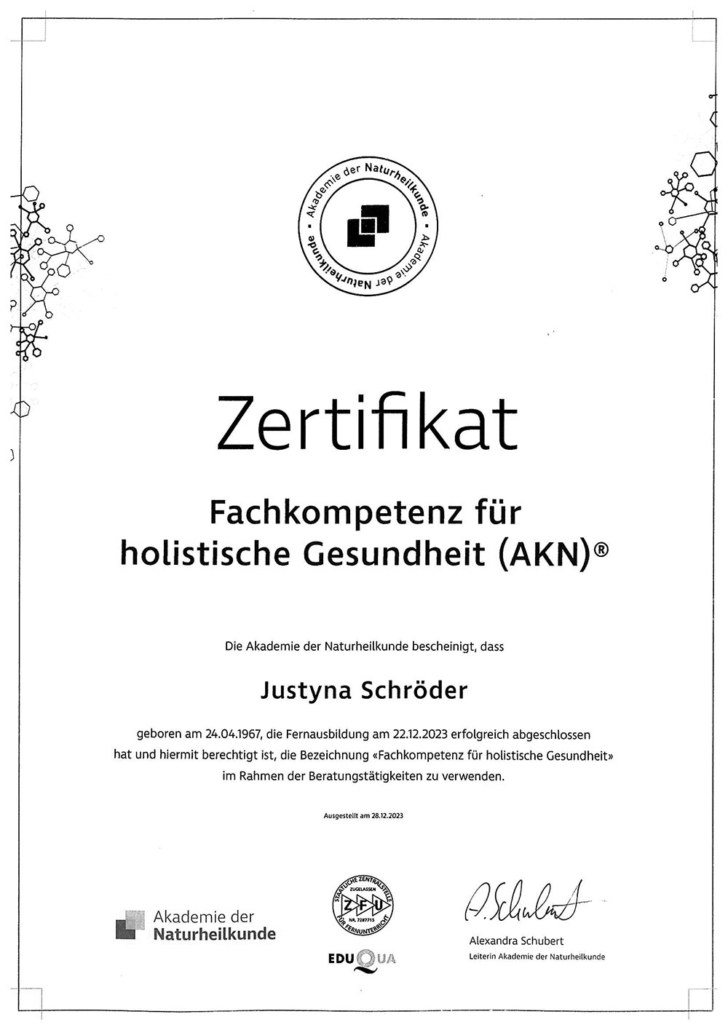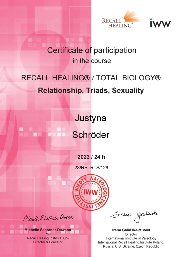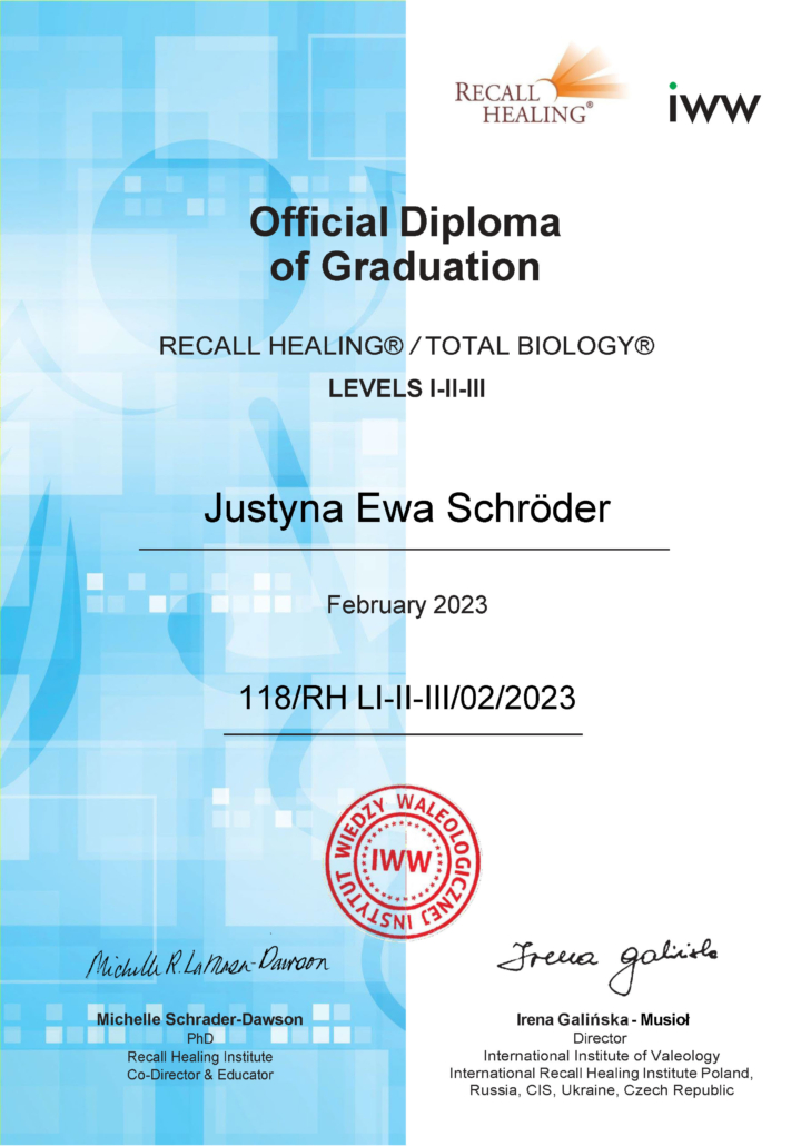 Ich erwerbe ständig neues Wissen und erweitere es durch neue Arbeitstechniken. Mein persönliches Ziel ist es, den Klienten im Prozess der inneren Veränderung besser unterstützen zu können und ihm dabei zu helfen, sich des Unbekannten bewusst zu werden. Aus den Beobachtungen und Erfahrungen vieler Berater auf diesem Gebiet wissen wir, dass die bloße Kenntnis eines bestimmten Ereignisses zur Heilung führen kann.